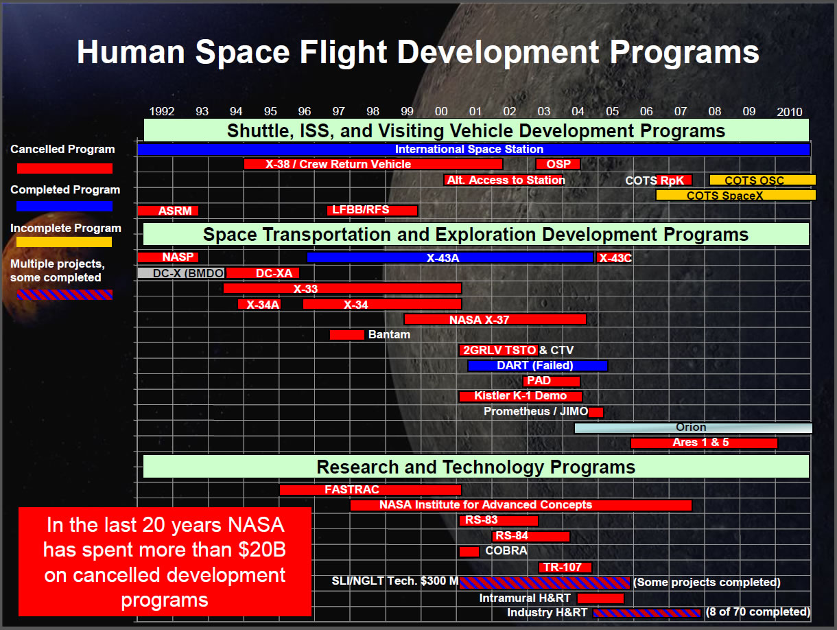 Unquestionably, NASA has cancelled a large number of human space flight development programs over the years, but at least one shown on this graphic was not cancelled — Orion, and at least one is not a human space flight program — Prometheus/JIMO, the nuclear-powered Jupiter Icy Moons Orbiter project initiated by former NASA Administrator Sean O’Keefe and cancelled shortly after his departure. The NASA Institute for Advanced Concepts (NIAC) also was not specifically related to the human space flight program and was not a development program. It was a grant-based program to fund studies of advanced concepts for NASA as a whole, and although it was terminated in 2007, it was reinstated in a modified manner in FY2011 as part of the Office of Chief Technologist. Even more importantly, the money allocated to it was spent on grants for studies that were completed. The National Research Council reviewed the work done through NIAC and advocated NIAC’s reinstatement.