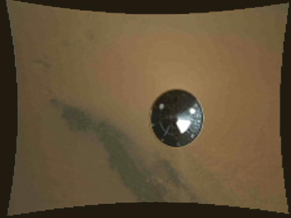 Another photo, also taken with MARDI, shows the rover’s heatshield after it had been ejected. It shows the 15 foot diameter heat shield when it was about 50 feet away from Curiosity.