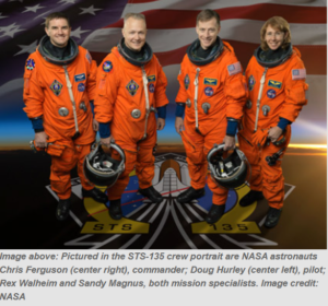 STS-135, the final space shuttle mission, launched on July 8 and landed on July 21, 2011.  It’s four-person crew was Chris Ferguson (commander), Doug Hurley (pilot), Sandy Magnus and Rex Walheim (mission specialists).