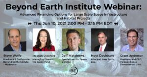 The Beyond Earth Institute (BEI) will hold a webinar on June 10, 2021 from 2:00-3:15 pm ET on “Advanced Financing Options for Large Scale Infrastructure and Habitat Projects.”