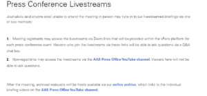 More information is on the event’s website. An emailed message says the following about livestreams of the press conferences Monday-Thursday (the link to the AAS Press Office Youtube Channel is https://www.youtube.com/c/AASPressOffice) Note that times are in PACIFIC STANDARD TIME (add three for Eastern).