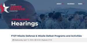 The Strategic Forces Subcommittee of the House Armed Services Committee (HASC) will hold a hearing on April 15, 2026 in 2118 Rayburn House Office Building at 3:00 pm ET on “FY27 Missile Defense and Missile Defeat Programs and Activities.”