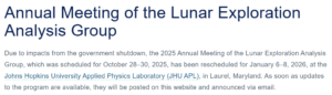 Original Entry: NASA’s Lunar Exploration Analysis Group (LEAG) will meet from October 28-30, 2025 at the Johns Hopkins University Applied Physics Lab in Laurel, MD. A virtual option is available.