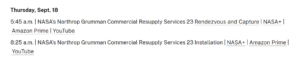 NG-23 CARGO MISSION ARRIVES AT ISS, Sept 18, 2025, Earth orbit, 5:45/7:18/8:25 am ET