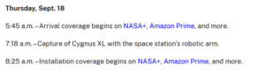 NASA coverage begins at 5:00 am ET for the 6:35 am ET arrival. Coverage of the installation of Cygnus onto the docking port begins at 8:00 am ET. Watch on NASA+ and Amazon Prime.