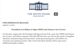 Original Entry: The White House announced that President Biden will sign the CHIPS and Science Act, H.R. 4346, which includes the 2022 NASA Authorization Act, in the Rose Garden on August 9, 2022. Other details are pending. It likely will be broadcast on the White House’s website.