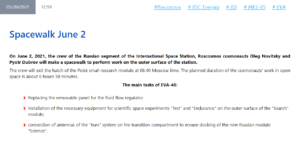 Two Russian cosmonauts, Oleg Novitsky and Pyotr Dubrov, will perform a spacewalk at the International Space Station (ISS) on June 2, 2021 According to the NASA TV schedule, the spacewalk begins at 1:20 am ET and NASA TV coverage starts at 1:00 am ET, with the spacewalk expected to last 6.5 hours.