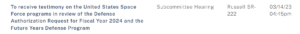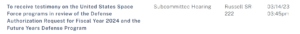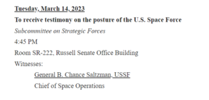 Original Entry: The Strategic Forces subcommittee of the Senate Armed Services Committee will hold a hearing on the Posture of the U.S. Space Force on March 14, 2023 in SR-222 Russell Senate Office Building at 4:45 pm ET.
