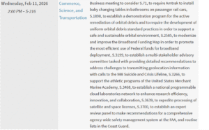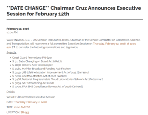 Original Entry: The Senate Commerce, Science, and Transportation Committee will meet in Executive Session on February 11, 2026 at 2:00 pm ET in S-216 in the U.S. Capitol to consider several bills including reconsideration of S. 3639, to expedite the processing of satellite and space licenses by the FCC, and S. 1898, the ORBITS Act. The committee began consideration of those and other bills on February 3, but a quorum was not present for votes. Ranking Member Maria Cantwell (D-WA) wanted to amend S. 3639, but Chairman Ted Cruz (R-TX), sponsor of the bill, did not agree so a vote was required.