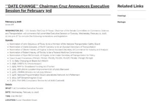 UPDATE, February 10: It is now posted on the committee’s website as a “date change” to the February 3rd markup. The location is S-207 Capitol, the Mansfield Room. The committee tells SpacePolicyOnline.com it will NOT be livestreamed because it’s in the Capitol, not one of the Senate office buildings (which are properly equipped).