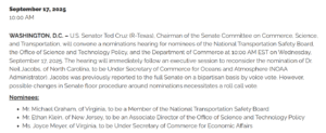 SENATE COMMERCE CMTE RE-VOTE ON NEIL JACOBS TO HEAD NOAA, Sept 17, 2025, DC, 10:00 am ET