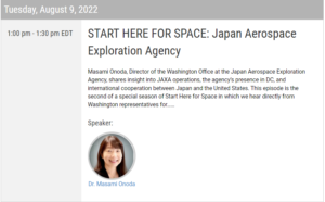 START HERE FOR SPACE, WITH JAXA’S MASAMI ONODA (Space Fndtn), Aug 9, 2022, virtual, 1:00-1:30 pm ET
