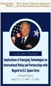 U.S. SPACE FORCE: IMPLICATIONS OF EMERGING TECH ON INTL POLICY AND PARTNERSHIPS (GaTech), Apr 12, 2021, virtual, 11:00-12:00 pm ET