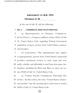 Others include one from Rep. Keith Self (R-TX) that directs the NASA Administrator to establish the initial elements of a lunar outpost by December 31, 2030, and a Rep. George Whitesides (D-CA) amendment calling for an engineering analysis of boosting the International Space Station into a higher orbit instead of deorbiting it into the ocean at the end of its lifetime.
